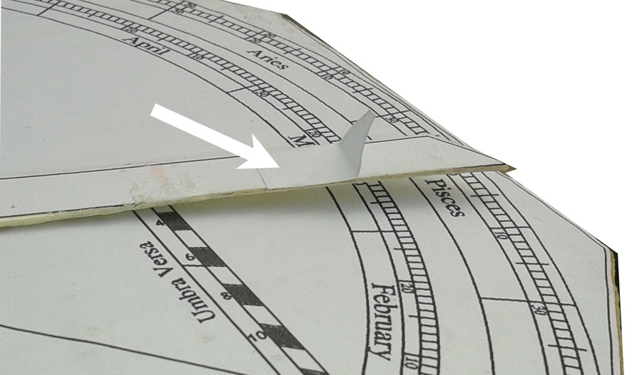 Carefully cut out the two small aiming aids (sights). Fold each sight along the dashed line. Each aiming aid has its destination position marked on the alidade. Glue each sight onto the proper marking on the alidade. Note that the sights easily get damaged. If this happens, you can always replace it with a new one cut from plain paper.