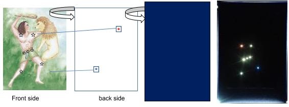 Modification of the constellation viewer to watch the colours of the stars You can modify the cards of the constellation viewer such that the brightest stars shine in the viewer in their corresponding colours. You can do this by colouring small pieces of a transparent sheet with permanent markers. Glue these small pieces at the back side of the corresponding stars of the constellation figures before gluing the figures on the blue cards). When you insert these modified cards, you will be able to see not only the constellation, but now also the colours of the brightest stars!