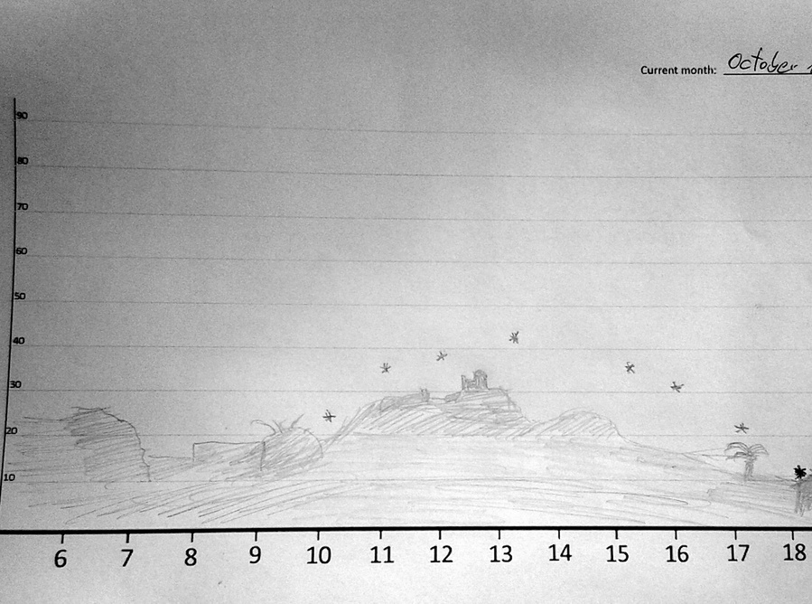 Return to your main drawing (Time vs. altitude), find - on the horizontal Time axis the position for the time you wrote down. From this position, use a ruler and find - on the vertical altitude axis - the position that corresponds best to the altitude of the Sun at that time. Mark this position with a small star to represent the Sun. Do the same with the part of the landscape you measured underneath the Sun.